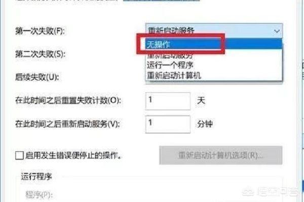 5、然后在“恢复”位置“第一次失败”和“第二次失败”都改为“无操作”。