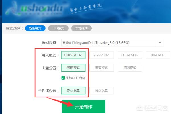 2、 接着,设置模式和格式,一般默认选择USB—HDD以及NTFS,点击一键制作成U盘启动PE,