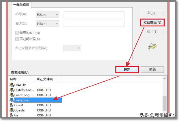 5.在出现的“选择用户或组”的界面,点击“立即查找”,在列表中找到“everyone”,点击“确定”。