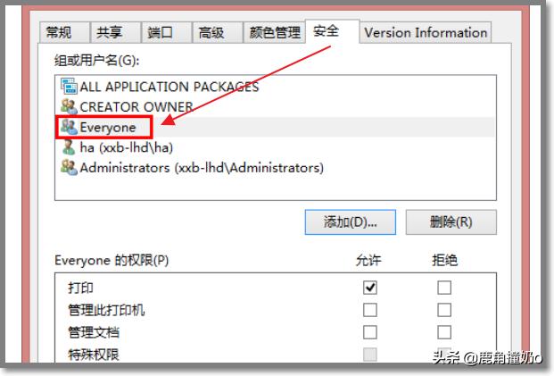7.可以看到“everyone”已经添加到“组或用户”的列表中,为其设置权限,我们在“打印”后面“允许”下的复选框打勾,只给分配打印权限。