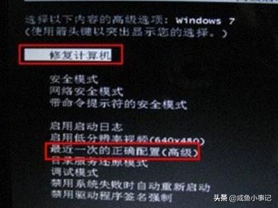 2、重启按住F8进入系统高级选项模式,然后选择最后一次正确配置恢复系统。