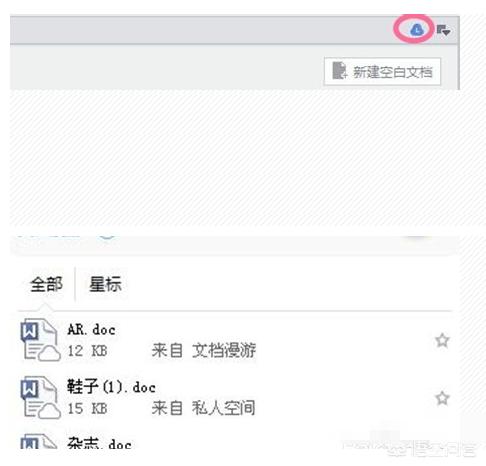 8.如果进入的是文档处理界面,点击右上面的云朵标识,在文档那个漫游文档下面可能可以找到加入收藏的云文档。使用这种方法时要求至少在手机上打开过该文档。